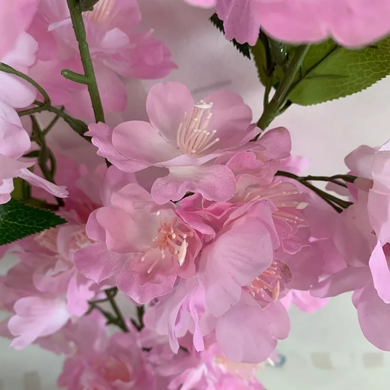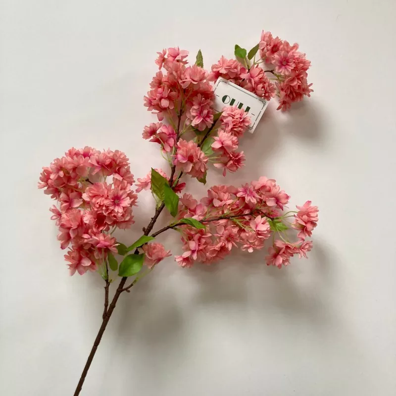 Bu süni albalı çiçəyi filialı birdən çox çiçək çəngəlləri və dörd dəst yaşıl yarpaq, ahəngdar və zəngin bir təbəqə yaradır.